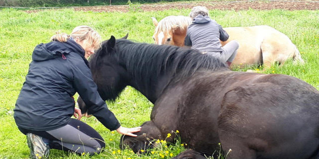 Nul besoin d'être cavalier pour vivre pleinement ces moments d'échange qui ont lieu dans les champs, en carrière, en balade à pied sur le site, avec le troupeau ou un seul équidé.